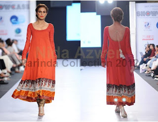 Brand new Haute couture and pret e porter collections by the name of Latest Parinda Formal Collection 2012 is showcased by Nida Azwer at Ramp.Frock with Churidar Pyjama,Long Shirts with Straight Trouser,Long Umbrella Frocks,Sleeve Less Front Open Shirts ,Saree and Funky Outfits are added in this Collection .All Dresses are Embellished with Zari,Embroidery ,Kora,Dabka and beads Work.This collection is suitable to wear as Formal and Parties occasion.